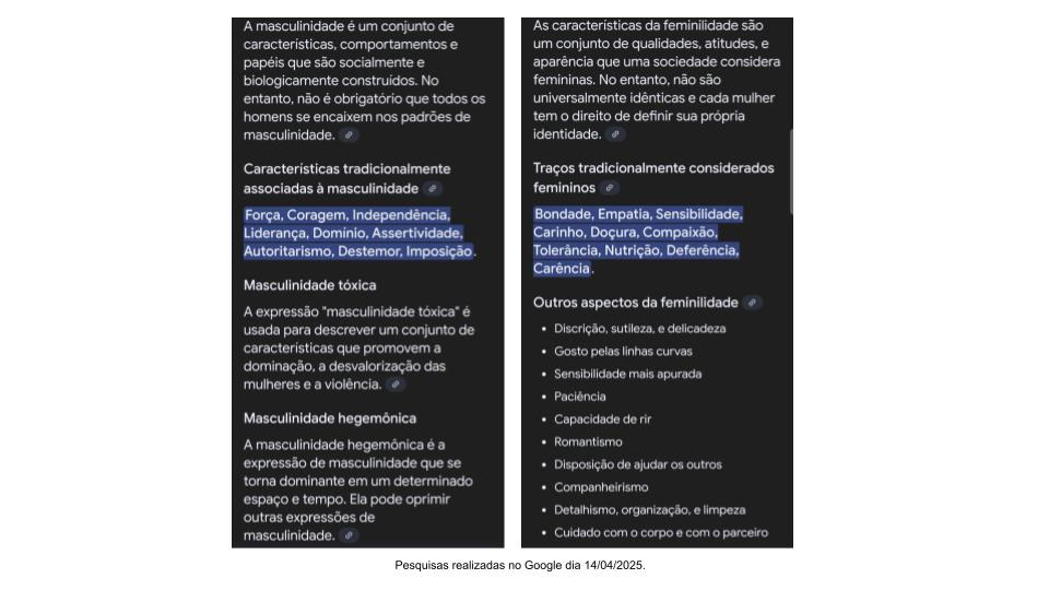 Quando estávamos pensando na metodologia pedagógica da oficina, pesquisamos no Google sobre o que seria masculinidade para entender o que a sociedade tem como base de referência e, assustadas com o resultado, pesquisamos sobre feminilidade. A percepção da sociedade brasileira sobre masculinidade e feminilidade são temas complexos e em constante transformação, influenciados por fatores culturais, sociais e históricos. Ainda é forte a influência de um modelo hegemônico de masculinidade, que associa o ser homem a características como força física e emocional, repressão de sentimentos para não demonstrar fraqueza ou vulnerabilidade, serem provedores, controle e dominância, e heterossexualidade compulsória. Segundo a pesquisa "Masculinidade hegemônica: repensando o conceito", de Robert W. Connell e James W. Messerschmidt, no que tange aos custos e às consequências, pesquisas em criminologia mostraram como padrões particulares de agressão eram ligados com a masculinidade hegemônica, não como um efeito mecânico do qual ela fosse a causa, mas através da busca pela hegemonia. Esse modelo tradicional, embora ainda presente, tem sido cada vez mais questionado, especialmente em virtude de suas consequências na violência de gênero e a dificuldade de homens em buscar ajuda psicológica. De modo geral, observa-se uma tensão entre modelos tradicionais e novas configurações de masculinidade, impulsionadas por movimentos sociais, discussões sobre igualdade de gênero e a própria redefinição de papéis na sociedade contemporânea.